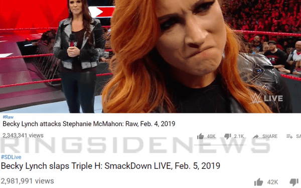 The video of Becky Lynch assaulting Stephanie McMahon is currently sitting at 2,343,341 views on YouTube. That is a big number, but the clip of The Man slapping Triple H did even better with 2,981,991 hits.
