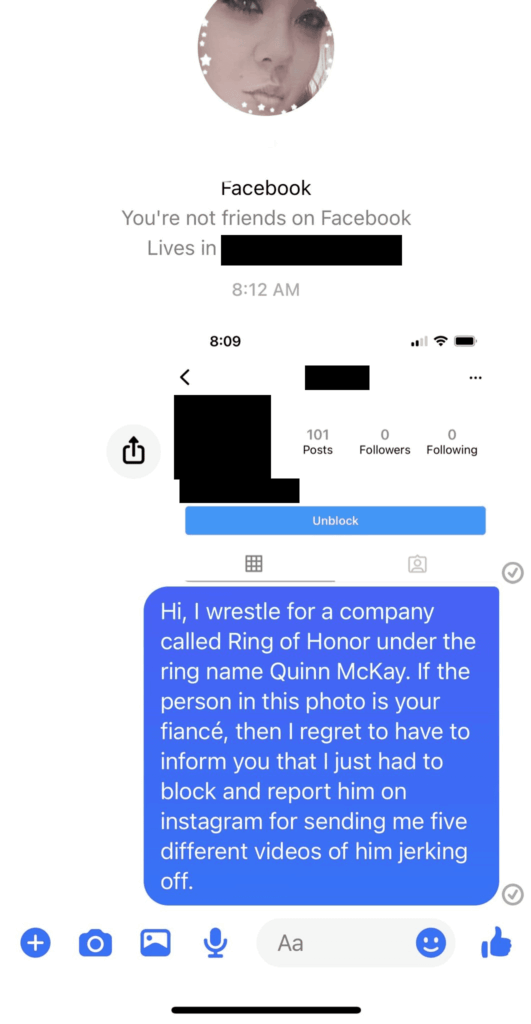 Former ROH wrestler, commentator, and interviewer Quinn McKay continues her stand against online perverts. I May of 2020, she made her intentions of busting the creeps public. McKay’s master plan to stop the harassment included finding the significant others of the guys who send her lewd material and let them know what they’re up to.