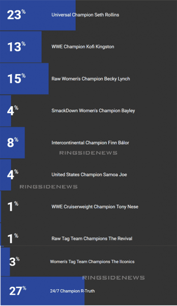 Becky Lynch seems to be coming in third in this poll with only 15% of the votes with Kofi Kingston trailing behind her with 13%. You can check out the entire poll results as of this writing in the graphic below.