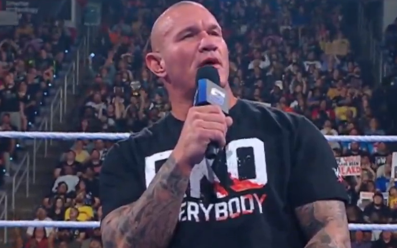 Orton opened up the second hour of SmackDown this week. He wore that new blood-covered RKO Everybody t-shirt, but he didn’t have any sort of smile on his face as fans sang his song.