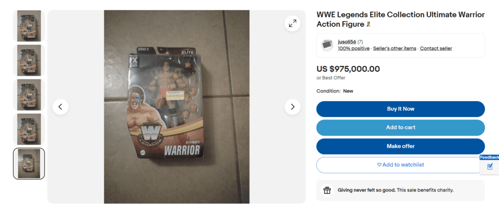 A fan recently took to eBay and is currently selling an action figure of The Ultimate Warrior, which he got as part of a clearance sale. Shockingly enough, he is selling the action figure for $975,000. To add to that, he is also charging $28.05 for shipping because he can.