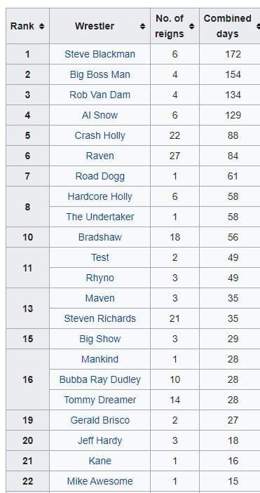 Raven’s longest reign with the Hardcore Championship, which has been officially recognized, was 31 days in December 2000. Regarding the days as the Hardcore Champion, Raven is presently ranked sixth all-time, trailing only Steve Blackman and Rob Van Dam.