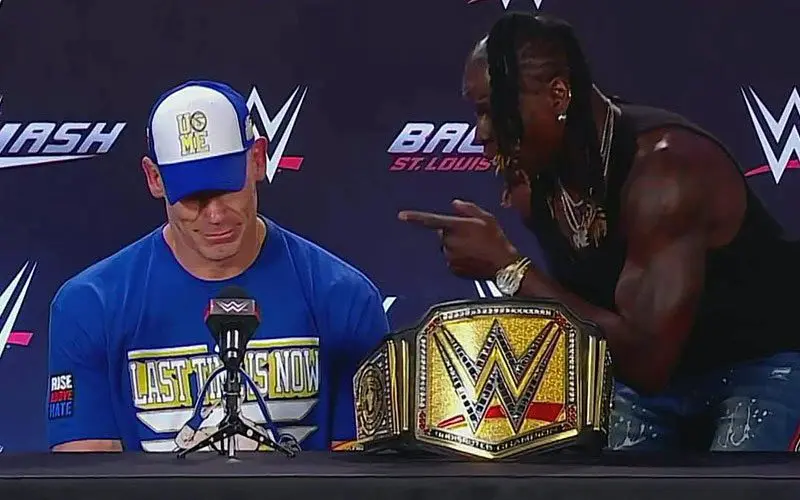 During the press conference, R-Truth approached Cena and praised him, saying, “You’re still the greatest, even though people say you can’t wrestle.” But that didn’t sit well with Cena, who told Truth to keep quiet or things would get ugly. When Truth spoke up again, Cena snapped, hoisting R-Truth up and delivering a vicious Attitude Adjustment through the title belt, leaving Truth laid out on the stage.
