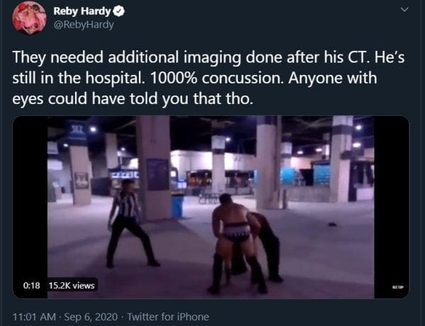 Following a trip to the hospital for Matt Hardy, Reby updated fans. She said that Matt “1000%” has a concussion. He’s still in the hospital as additional CT scans were needed.
