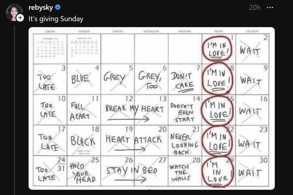 On her Threads account, Reby Hardy dropped a few interesting posts. One was a calendar of December 2023. This was very interesting because each day of the week said: “Too Late, Blue, Grey, Grey Don’t Care, I’m In Love, Wait” The caption to the post said, “It’s giving Sunday.”