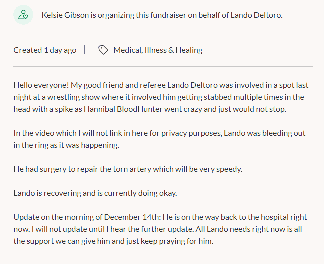 Lando Deltoro, the referee who was brutally spiked by Devon “Hannibal” Nicholson’s Blood Hunter character at a recent independent wrestling show, has returned to the hospital. The news was posted to the GoFundMe set up to help with his medical care.