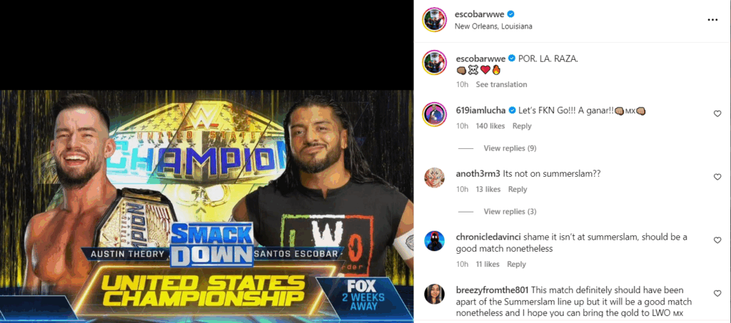 Escobar took to social media following the match to share a photo of his upcoming match with Austin Theory for the United States Championship. Rey Mysterio also commented on the post, encouraging Escobar to pick up the win.