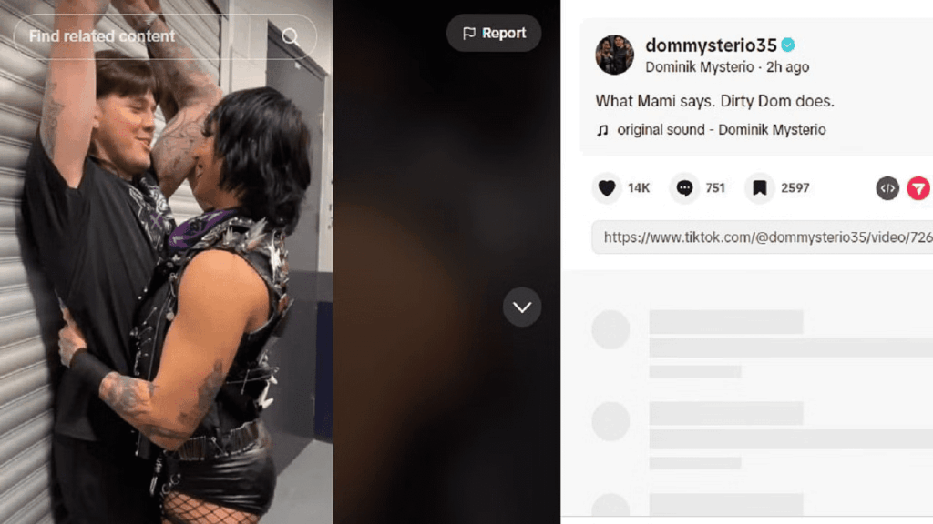 Rhea Ripley and Dominik Mysterio’s playful relationship continues to capture fan attention in a big way. In a new TikTok video shared by Dominik, Rhea Ripley can be seen playing a prank on him. The prank ends with Rhea Ripley pinning Mysterio to a wall. Mysterio commented on the video, making it clear he will do whatever Ripley wants.