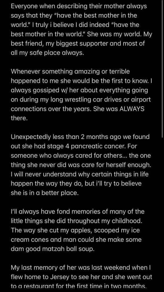 Mr. Stone recently took to Twitter to reveal that he lost his mother to pancreatic caner. The NXT star shared a heartfelt note in the wake of her mother’s passing. Read it below.