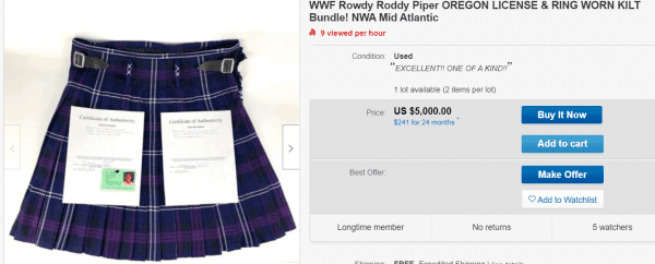 Roddy Piper’s Oregon driver’s license and a blue kilt is now on sale for $5,000. The description reads: