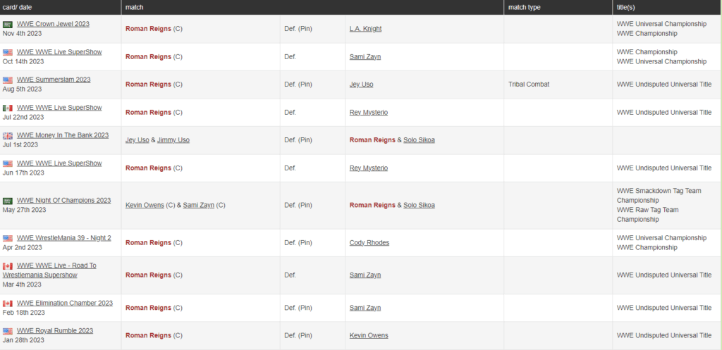 According to the numbers over at Profightdb, Roman Reigns has graced us with his presence in just 11 matches throughout the entirety of 2023. And this includes not only his appearances on live events but also his larger-than-life showdowns at Premium Live Events. It all began with a resounding victory over Kevin Owens at the Royal Rumble, and his most recent bout saw him triumph over LA Knight at Crown Jewel earlier this month.
