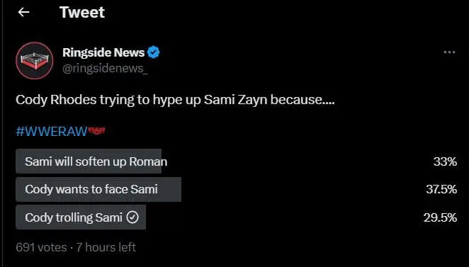 Ringside News’ official Twitter account posted a poll after Sami Zayn and Cody Rhodes’ promo on RAW. We asked why Cody Rhodes hyped Sami up, and there was a pretty even result across the three options: Sami will soften up Roman, Cody wants to Face Sami, and Cody trolling Sami. That being said, 37.5% of those fans polled believe that Cody would rather face Sami at WrestleMania.