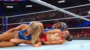 Rousey sent Flair into the barricade and then back in the ring before Rowdy Ronda Rousey turned it up and so did Charlotte. There were still shots all over the place and Flair threw everything she had at the former UFC fighter.