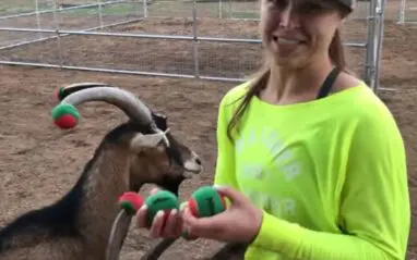Rousey had a good laugh at the way her farm friend looked with red and green tennis balls on the end of his horns, but that’s what he gets for being a naughty goat.