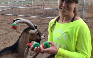 They had an issue to deal with this time around and it had to do with their goats. One goat was picking on the other, so Rousey dressed him up with Christmas colored tennis balls on his horns. Maybe that’ll teach him a lesson.