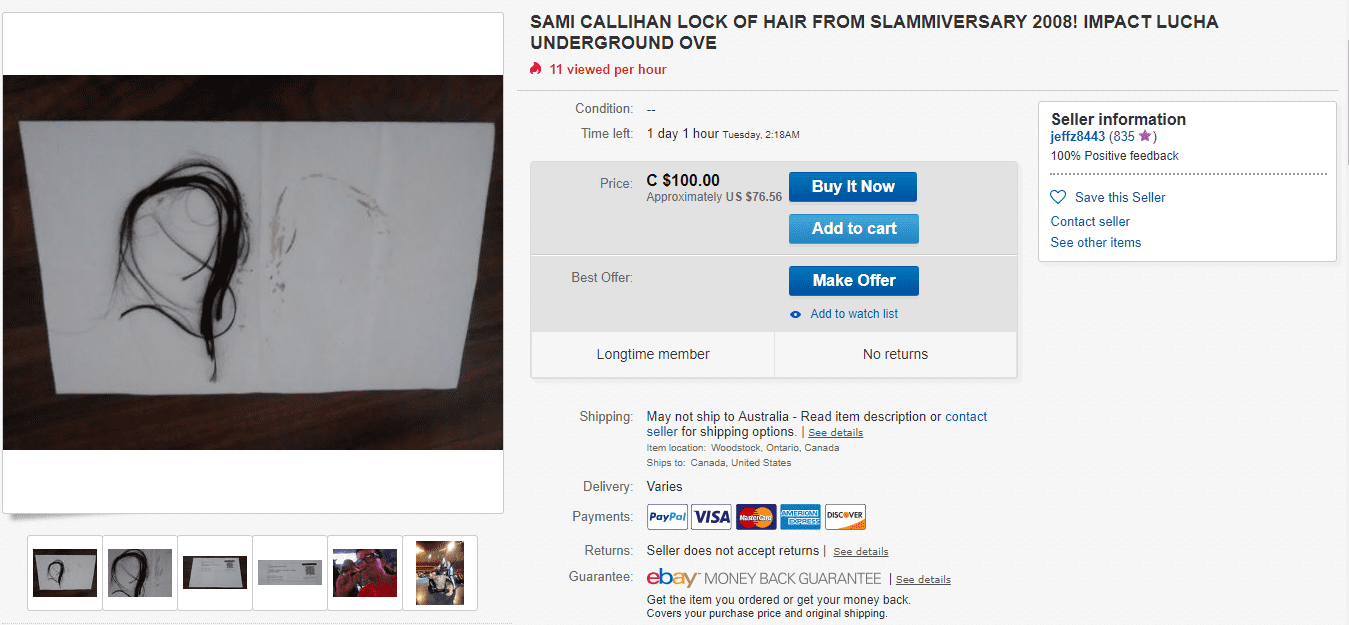 While on the ramp as guards and Fenix had oVe at bay, Pentagon Jr. was able to provide Callihan with a haircut. It now appears a fan has taken a good portion of the hair and is intent on selling it for $100 Canadian dollars on eBay.