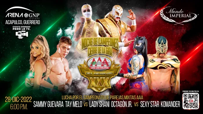 Sammy Guevara and Tay Melo’s next defense of the AAA Mixed Tag Team Championships have also been announced. They will defend the belts in a triple threat match at Noche De Campeones on December 28 from Acapulco, AAA revealed on Saturday. Lady Shani & Octagon Jr. and Sexy Star & Komander will be their opponents.