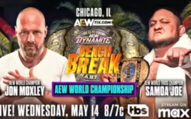 On the April 23 episode of AEW Dynamite, the company confirmed that Samoa Joe will challenge Jon Moxley for the AEW World Championship at Beach Break on May 14. This announcement comes just one week after Joe choked out Moxley to win the AEW Trios Titles alongside Powerhouse Hobbs and Katsuyori Shibata as The Opps.