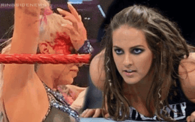 Logan kneed Dana right in the back causing her head to smack off the post and then the blood started pouring before the match was called off. As Sarah Logan saw this replayed on Main Event, she commented saying that if she could have this to do over again she would have done it slower.
