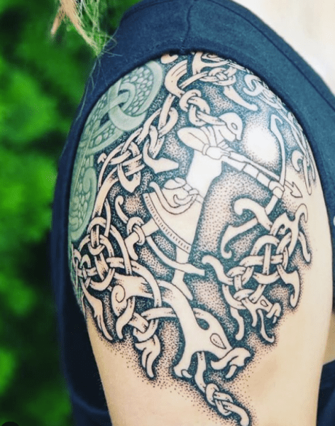 Tattoos are a lot of fun, but they’re also pretty painful. It’s a good think that Sarah Logan seems to have a high tolerance for pain, because her Viking willpower got her though a huge back piece.