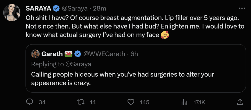 Saraya didn’t shy away from addressing this accusation and openly admitted to having breast augmentation surgery and receiving lip filler treatments over five years ago but questioned to the fan about what other things she may have had done in a now deleted this tweet.