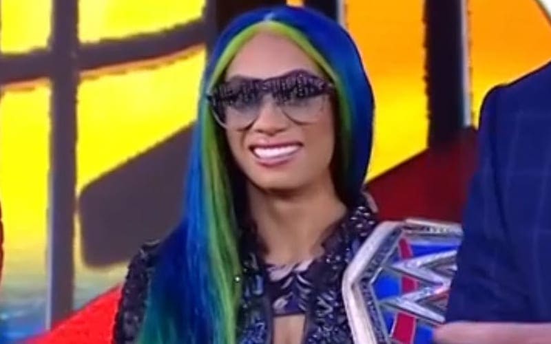 The WWE locker room took the stage to start out WrestleMania. Vince McMahon came out as well and he welcomed fans back and said “thank you.” Sasha Banks had a spot right behind Vince McMahon and she had a much different look.