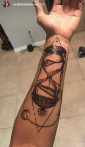 This new ink looks like it could be the outline waiting to get finished because a design like this could get a lot of new details in it. But the hourglass design is a pretty cool addition to Banks’ arm.