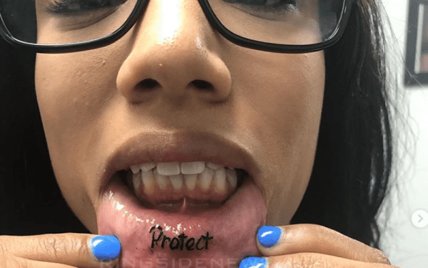Tattoo artist Jonathan Garcia posted a picture of The Boss with her new “Protect” inner-lip tattoo. She looked pretty happy to have this new ink and be done with the painful experience. He wrote about giving Banks her first tattoo: