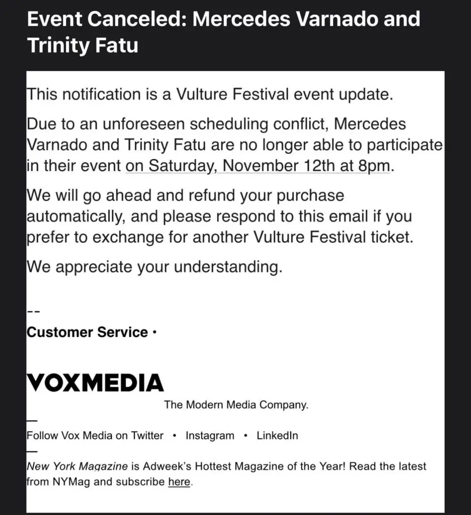 We will go ahead and refund your purchase automatically, and please respond to this email if you prefer to exchange for another Vulture Festival ticket.