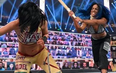 Sasha Banks didn’t let Bayley leave the ThunderDome during Clash Of Champions without getting a severe beating. Bayley tried to end things with a chair as she took out Asuka and caused a DQ, but The Boss had a chair of her own. Banks also used a kendo stick to assist in her assault.