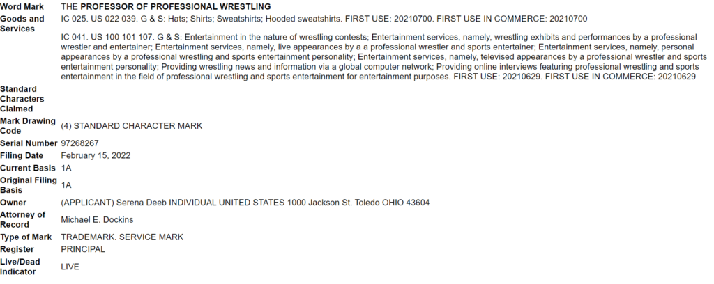 The AEW standout is looking to cash in on the character and gimmick. Paperwork was filed on February 15 by Serena Deeb to trademark “The Professor of Professional Wrestling.” The filing reads as follows:
