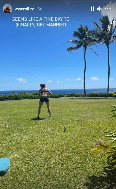 Rollins updated his Instagram story with a photo of Becky Lynch. She was standing out in a grassy area in casual clothes. The caption for this photo really drove fans crazy online as they started filling the Internet Wrestling Community with messages of congratulations.