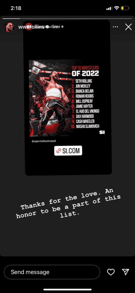 The Drip God seemingly had a successful 2022 with high-profile matches and reclaiming gold after nearly 2 years. Seth Rollins recently responded to Sports Illustrated naming him #1 among the Top 10 List of Best Wrestlers of 2022 on his Instagram Story.