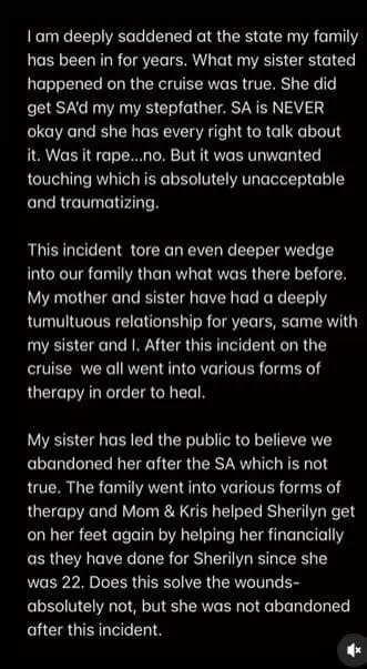 I am deeply saddened at the state my family has been in for years. What my sister stated happened on the cruise was true. She did get SA'd my stepfather. SA is NEVER okay and she has every right to talk about it. Was it rape…no. But it was unwanted touching which is absolutely unacceptable and traumatizing.
