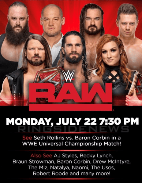 An advertisement for the July 22nd RAW event is promoting a Universal Title match between Seth Rollins and Baron Corbin. It is unknown whether this match will be on the actual broadcast or it is a promoted dark match to bring in fans.