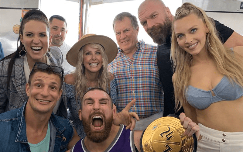 Triple H posted a picture from Rob Gronkowski’s beach party. Stephanie McMahon had a big smile on her face and WWE 24/7 Champion Mojo Rawley was there with his title too.