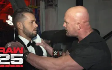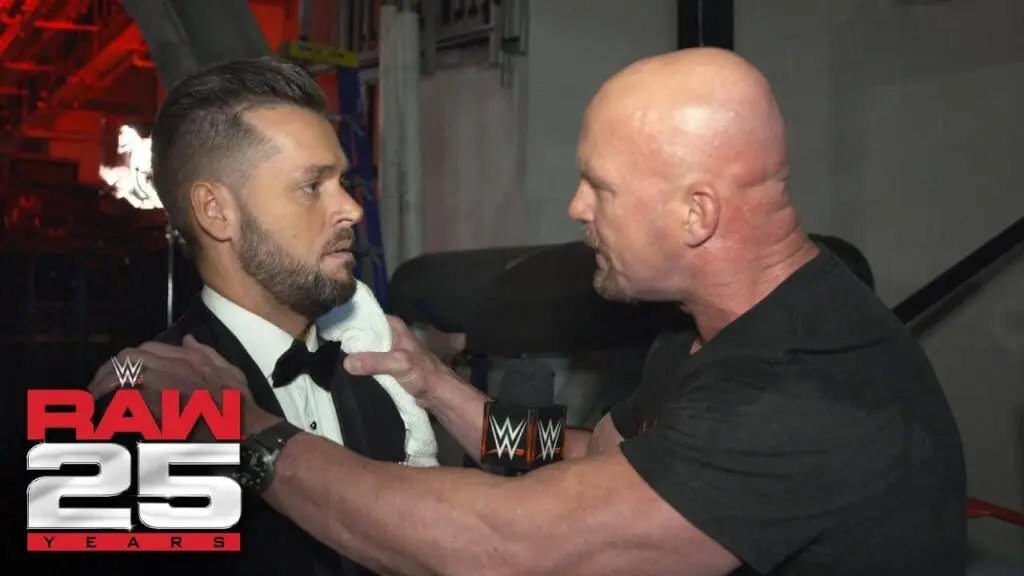 Mike Rowe caught up with “Stone Cold” Steve Austin after he delivered a Stone Cold Stunner to Vince and Shane McMahon on tonight’s RAW 25th Anniversary show.
