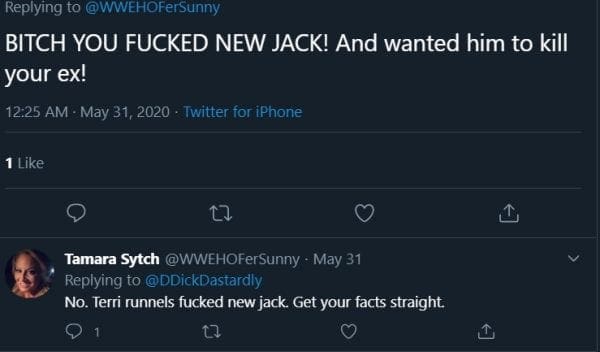 Tammy Lynn Sytch was quick to correct this fan. She stated that he must have mistaken her for Terri Runnels. “No. Terri runnels f*cked new jack. Get your facts straight.”