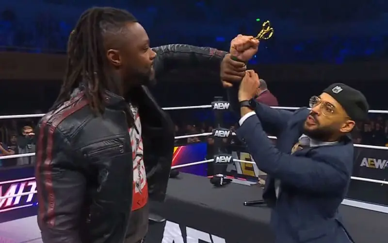 Swerve Strickland and Ricochet will battle at Revolution this weekend in a #1 contender match. This week on Dynamite, they kicked off the show with a contract signing. Obviously, things got ugly.