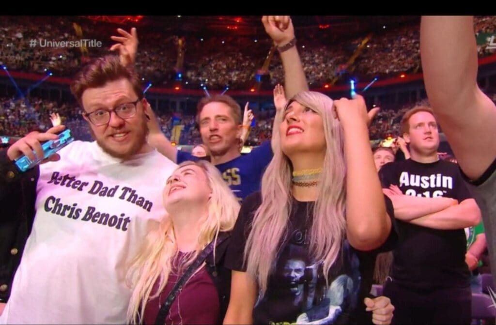After the main event between Drew McIntyre and Roman Reigns for the WWE Undisputed Universal Championship, there was a bit of a sing-along between Drew and Tyson Fury in the ring. However, during one of the songs, one fan in the crowd was shown wearing a “Better Dad than Chris Benoit” shirt.