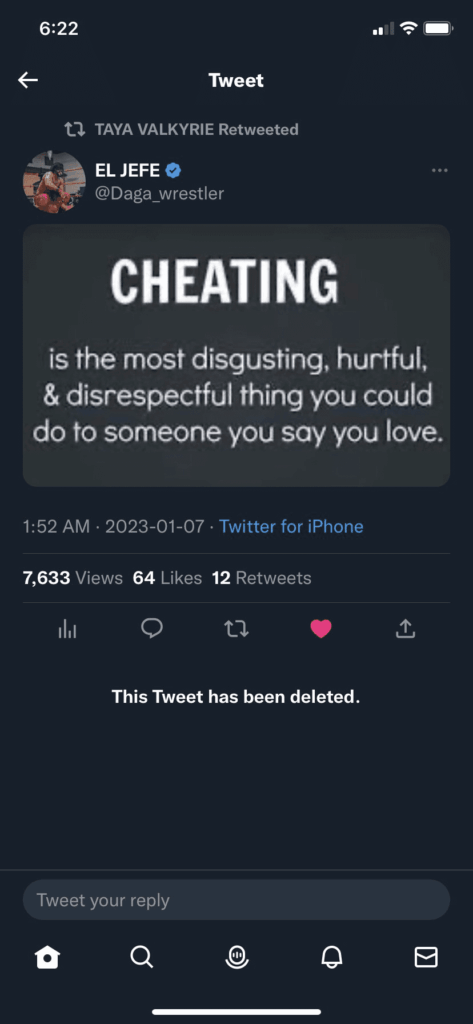 Tessa Blanchard’s husband, Daga, sent out a meme with a very interesting message. While he didn’t call his wife out for cheating, the message of the text graphic was pretty clear.