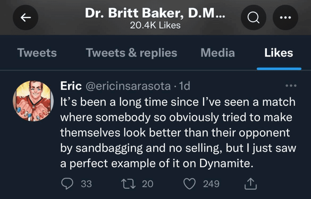 A fan tweeted that the bout was an obvious example of sandbagging and no-selling. The author later mentioned in the replies that he was referring to the Thunder Rosa vs Marina Shafir matchup. Judging by who liked it, it is clear Thunder Rosa is being accused of being uncooperative in the ring.