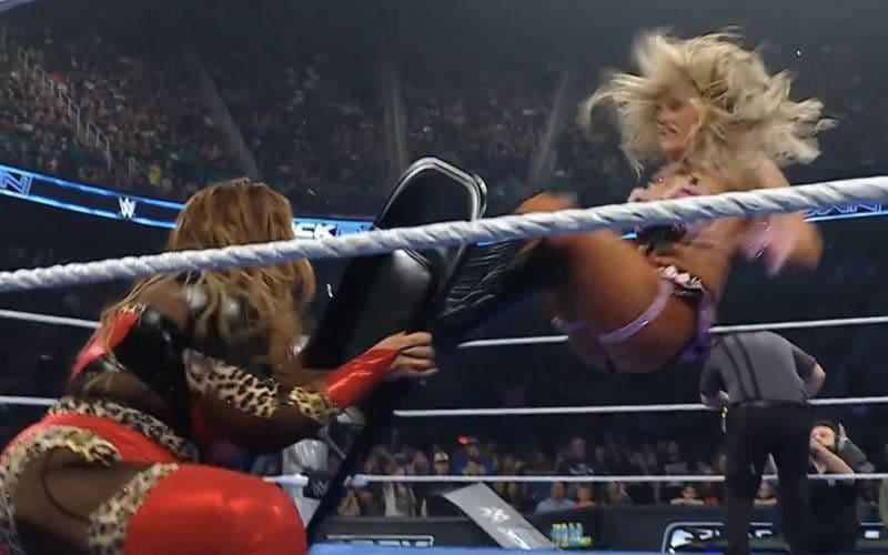 In the middle of the match, Naomi’s music hit and The Glow came out with a steel chair. She made her way to the ring, and the referee stopped her. Then Jade Cargill made her way out to take care of Naomi. The Glow whiffed a chair shot with Cargill, and then they ended up fighting in the crowd.