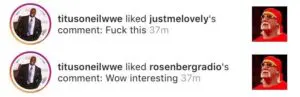 Titus also displayed more hate for The Hulkster by “liking” a status from a fan that wrote “F*ck this” in regards to the news of Hogan’s suspension being lifted.