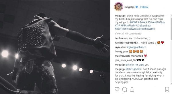 TJP recently threw a pretty big shot on Instagram, but it wasn’t in the actual photo he posted. Instead, it was in the comments section where he said that he didn’t “shake enough hands or promote enough fake positivity” to get a main roster call-up.