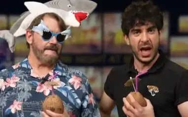 Khan and Tony Schiavone cut another great promo, and TK acted a bit drunk the whole time, but we have no way of knowing what was really in that coconut he was drinking from. They were dressed up for Beach Break and Schiavone even had a shark hat on. Tony Khan referenced that hat by calling himself a shark.