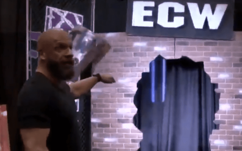 While giving the WrestleMania AXXESS tour today, Triple H took a shot at the old ECW arena when they came across a display of what represented what ECW used to be. Triple H joked about how minor league ECW was by mentioning that you can play bingo just behind the curtain.