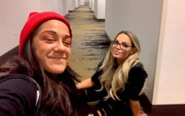 Bayley then shifted her focus recently to the former WWE Diva of the Decade, Trish Stratus. The former Hugger posted a photo of herself with Trish on Twitter, where both are sitting in a hotel hallway, from the time she and Sasha Banks lost the Women’s tag titles and used the same trick she did with Lita to get into her mind.