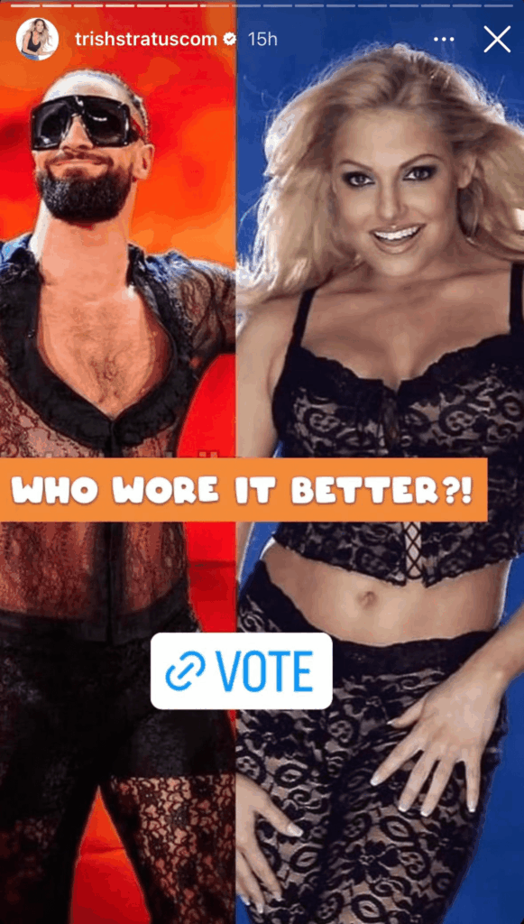 Trish Stratus took to TikTok and uploaded a hilarious video, where she compared her own attitude during her WWE days to Rollins’ most recent outfit. She then asked fans who wore their respective outfit better. She even took to her Instagram stories and asked the same question.