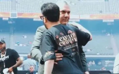 New footage captured from inside the venue shows Alalshikh greeting Nick Khan with a hug before both took their seats for the fight, surrounded by cameras, media, and high-profile guests. The moment happened during the massive Canelo Álvarez vs. Terence Crawford event, which drew global attention and a stacked celebrity presence.